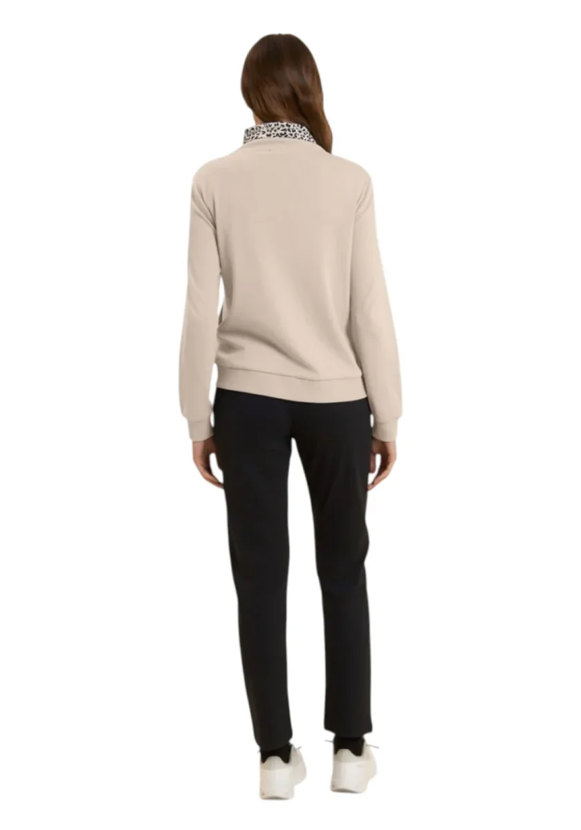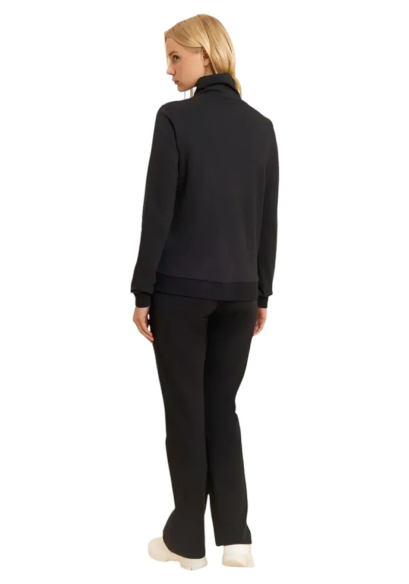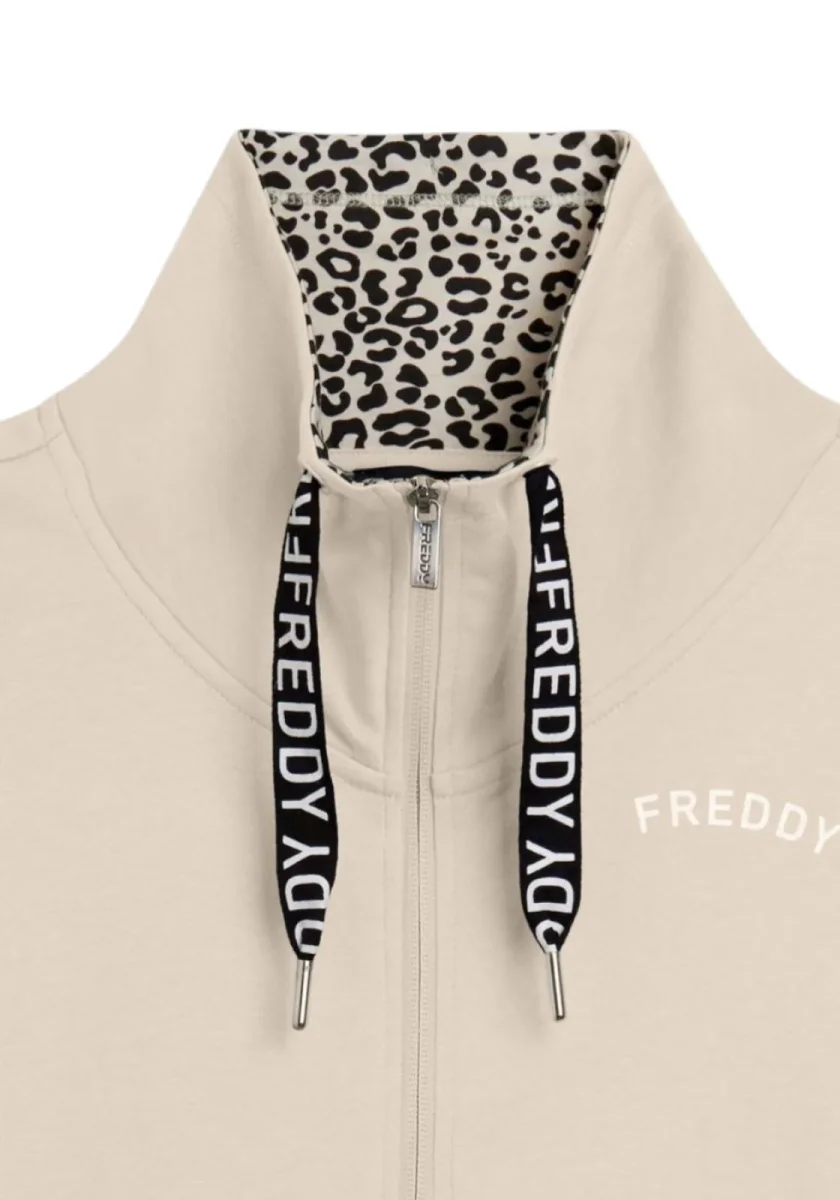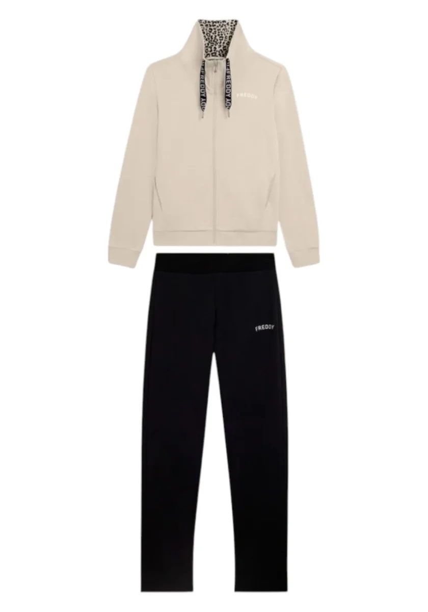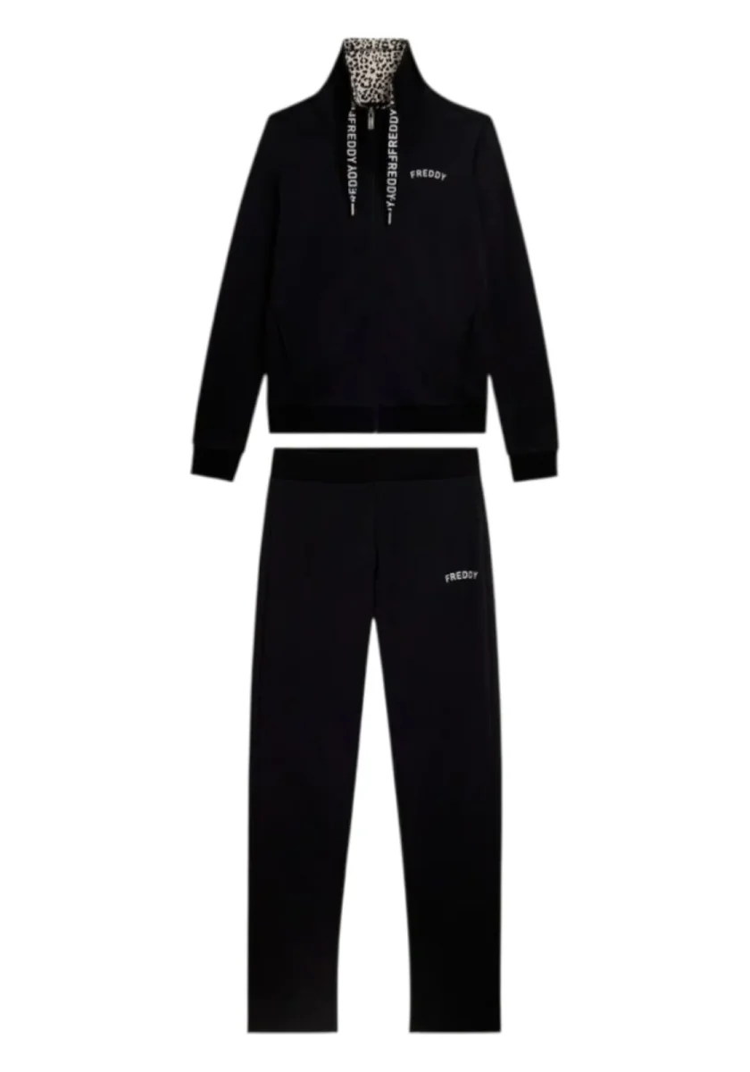 Un look deciso per questa tuta in interlock 100% cotone, che unisce comfort e personalità. La felpa ha collo alto foderato in jersey stampato animalier, zip in tono e coulisse logata. Fondo in costina e maniche con polsini. I pantaloni hanno vita regular con coulisse e fondo dritto. Logo FREDDY glitter bianco su cuore e fianco. Tasche anteriori interne sulla felpa.