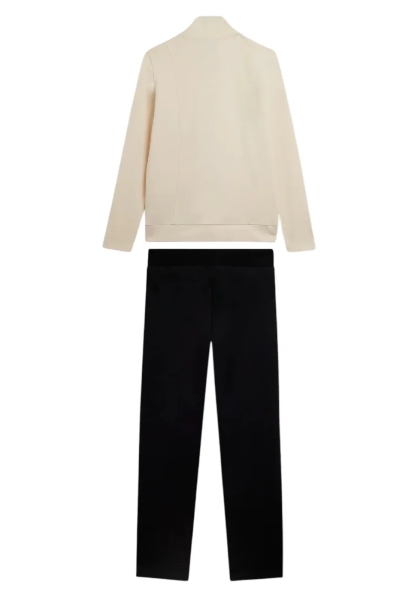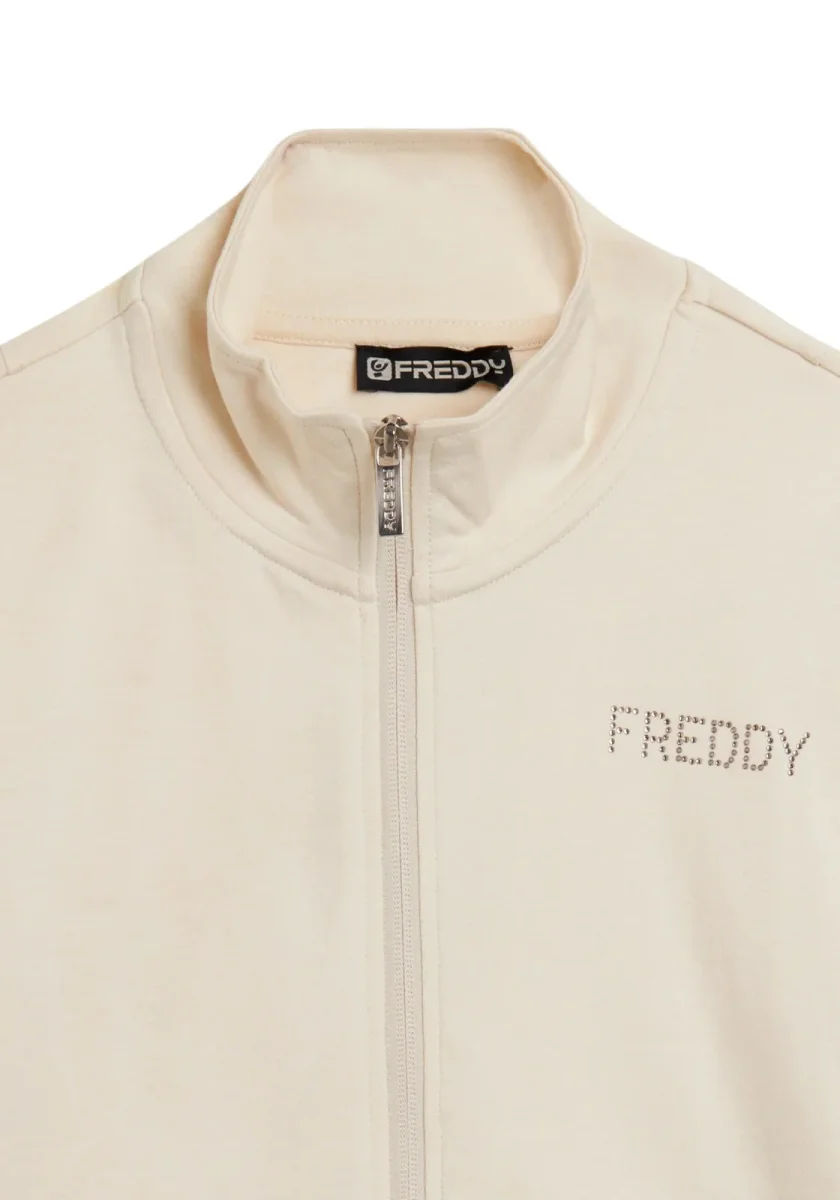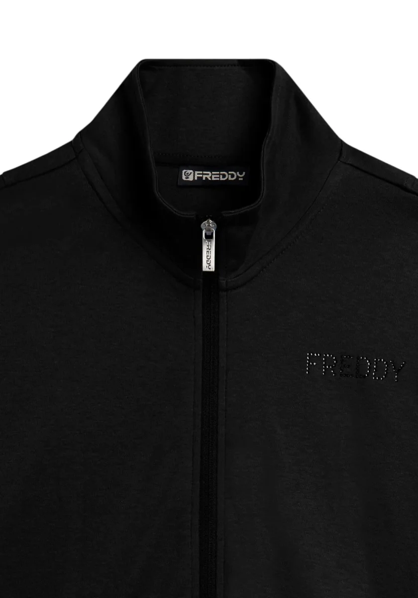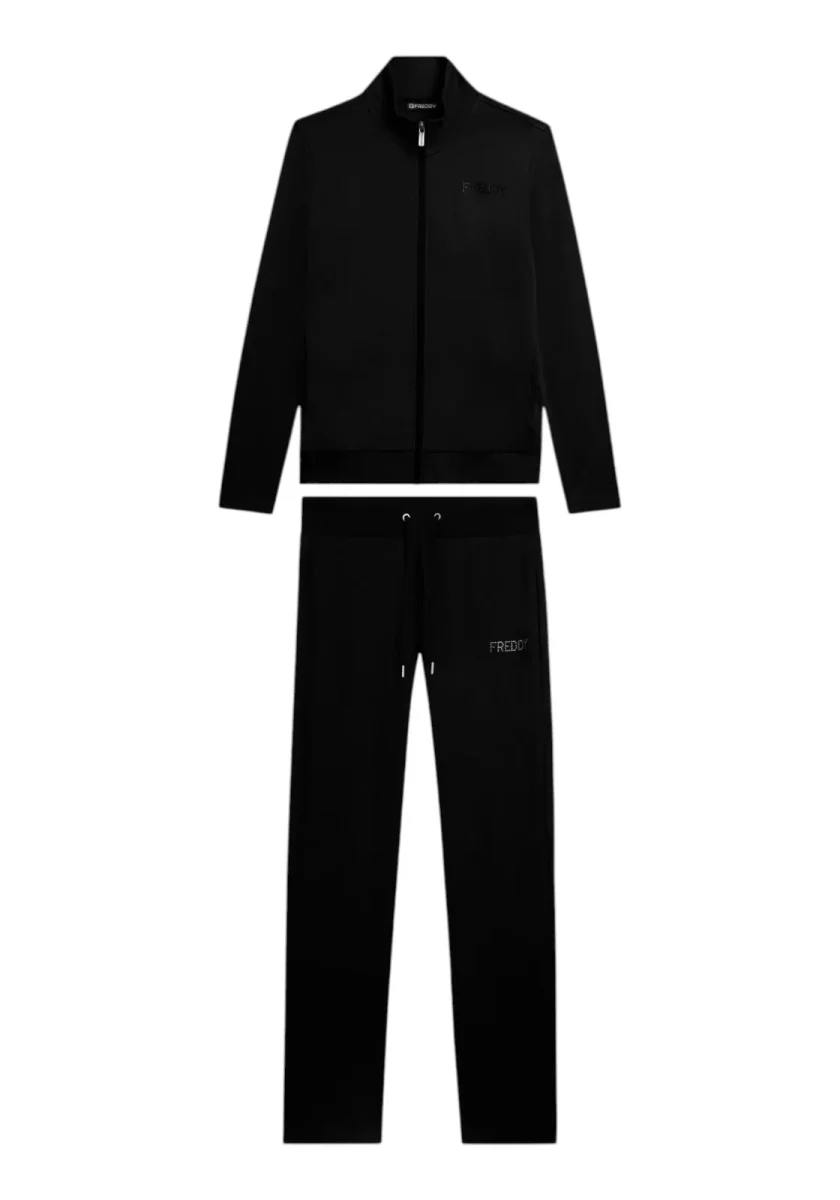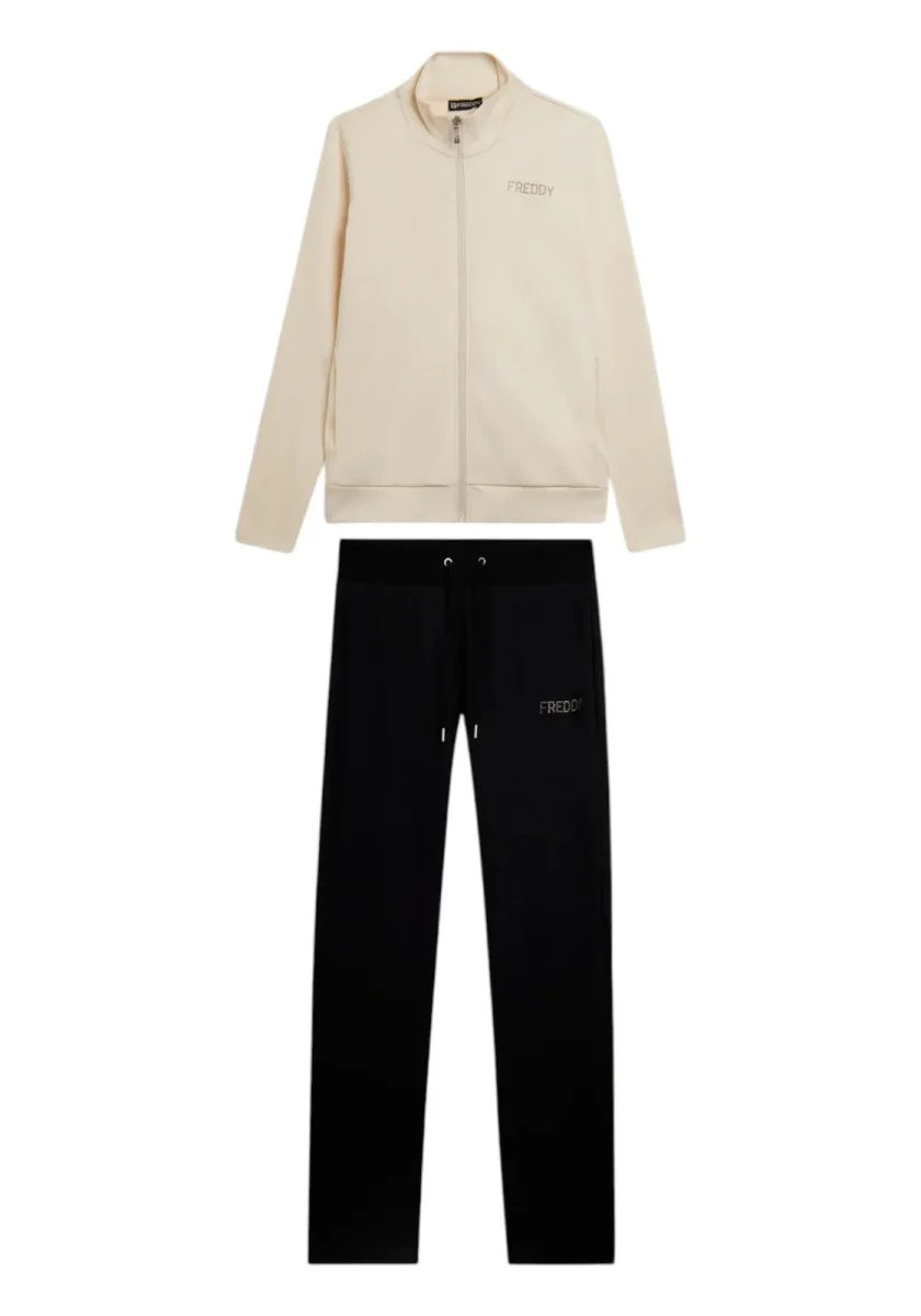 Questa tuta in interlock 100% cotone unisce eleganza e comodità. La felpa ha zip tono su tono, collo alto e maniche aderenti senza polsini, con fascia in costina al fondo. I pantaloni sono regular fit con coulisse e fondo dritto. Il logo FREDDY con strass dona un tocco brillante su cuore e fianco. Tasche anteriori interne sulla felpa.