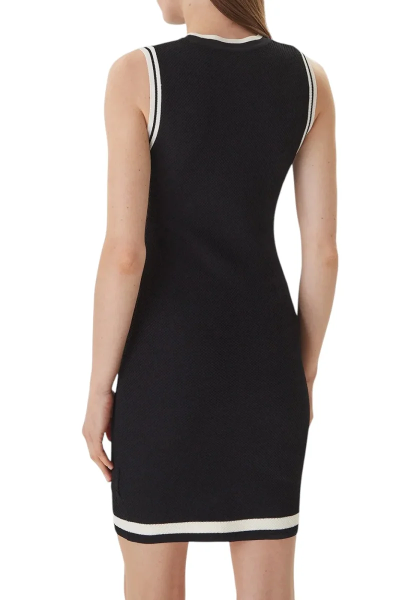 Vestito corto da donna Guess dal design moderno e femminile, realizzato in maglia elasticizzata di viscosa che garantisce comfort e una vestibilità aderente. Il modello presenta girocollo, struttura senza maniche e taglio bodycon, ideale per valorizzare la silhouette. Il look minimal è completato da ricamo con logo Guess, perfetto per outfit casual o serali dallo stile contemporaneo.