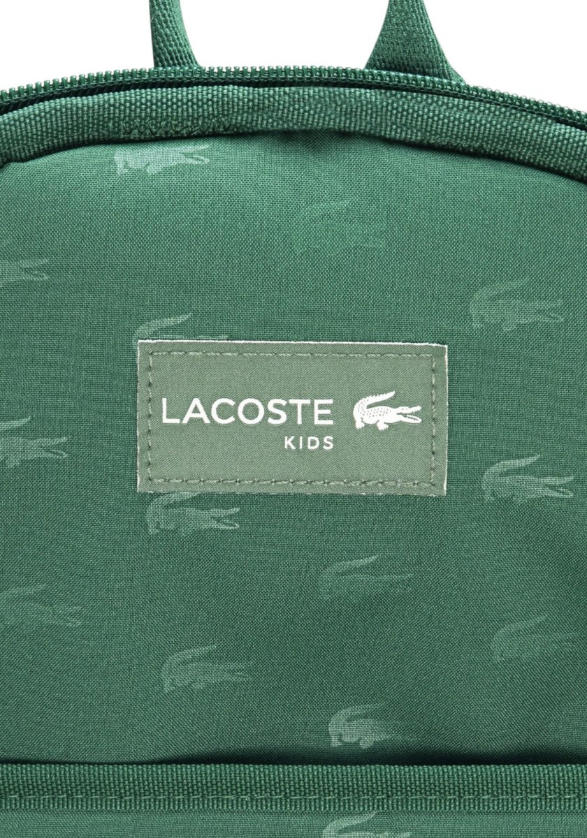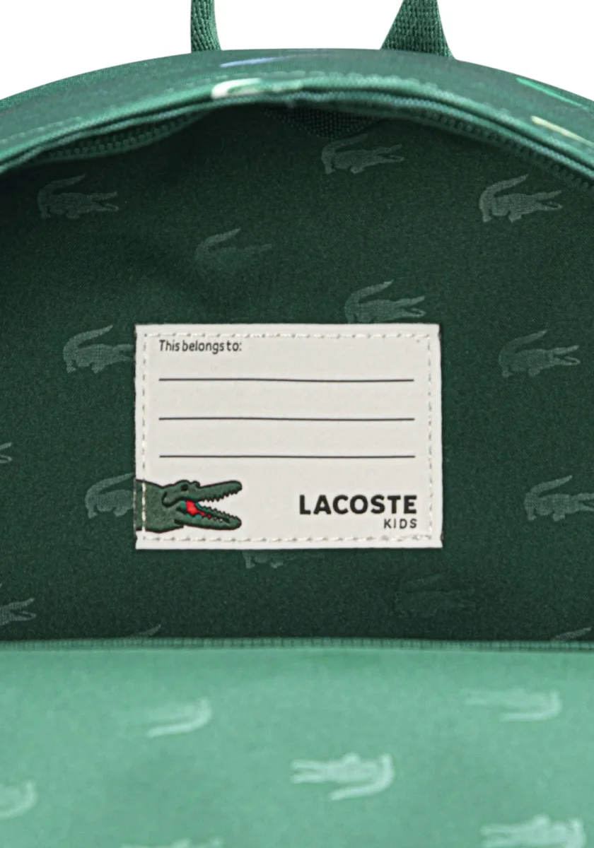 Zaino Lacoste Kids in tessuto verde con stampa allover di piccoli coccodrilli multicolore. Presenta un ampio scomparto principale con etichetta interna per il nome, tasca frontale con maxi logo ricamato, spallacci imbottiti regolabili e dettagli in tessuto coordinato. Include un charm a forma di coccodrillo. Ideale per scuola e tempo libero.